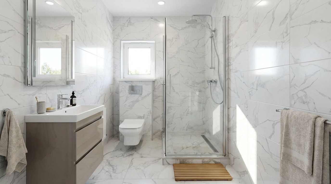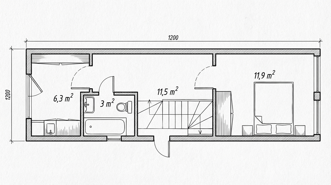 | Sanitaires | Cabine de douche 90×90, WC suspendus (bâti-support) aux 2 étages, Lavabo avec meuble |