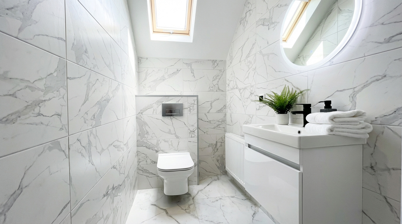 | Finition SdB | Plafond en plaques de plâtre (blanc) & Murs entièrement carrelés |