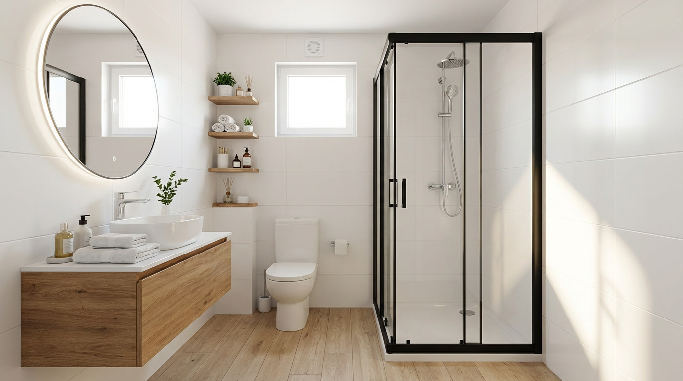 | Finition SdB | Panneaux bois naturel & Carrelage |