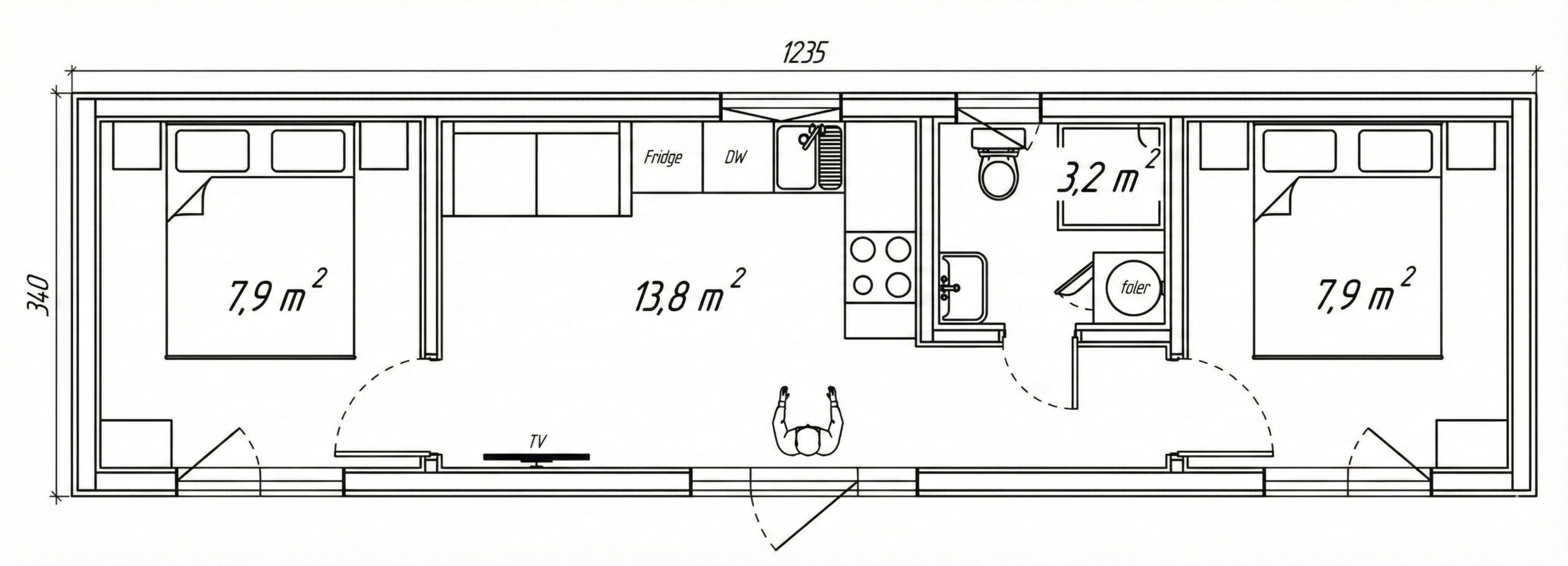 | Dimensions extérieures | 12.35 x 3.4 x 3.3 m (L x l x H) |