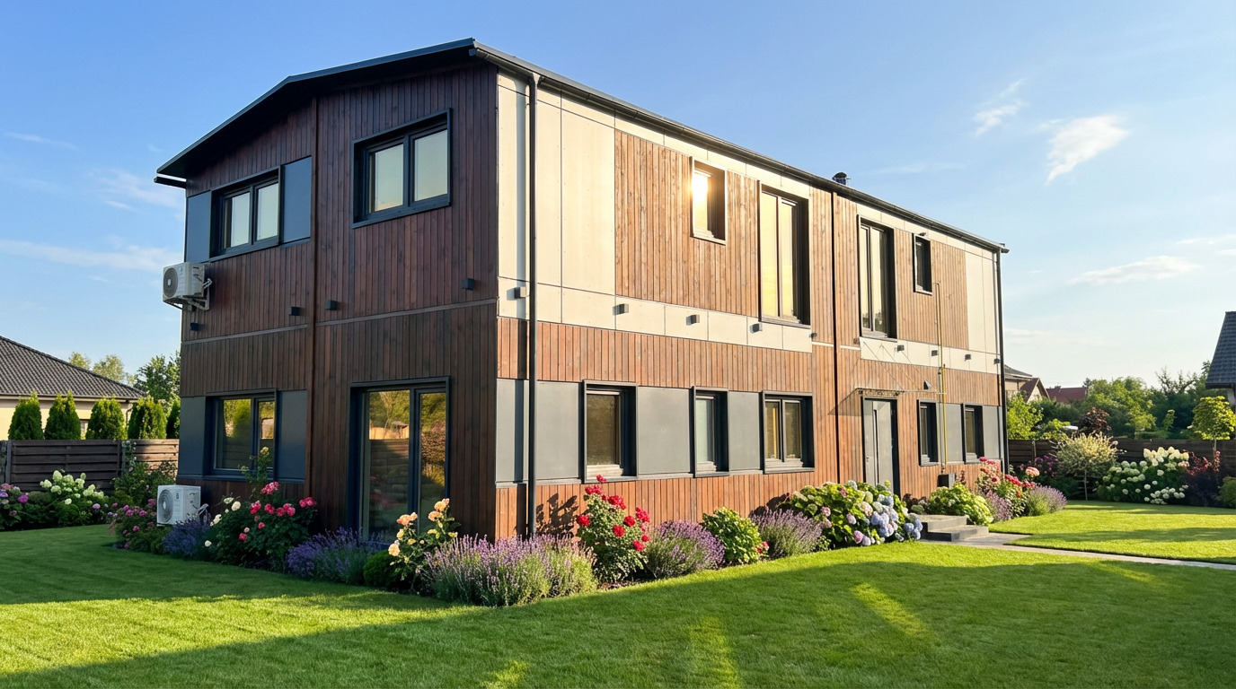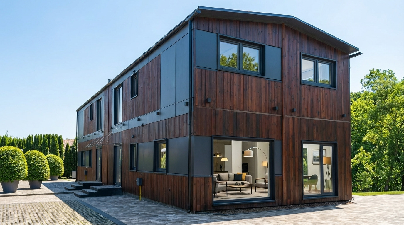 | Façade extérieure | Combinaison de panneaux à joint debout et d’épicéa scandinave |