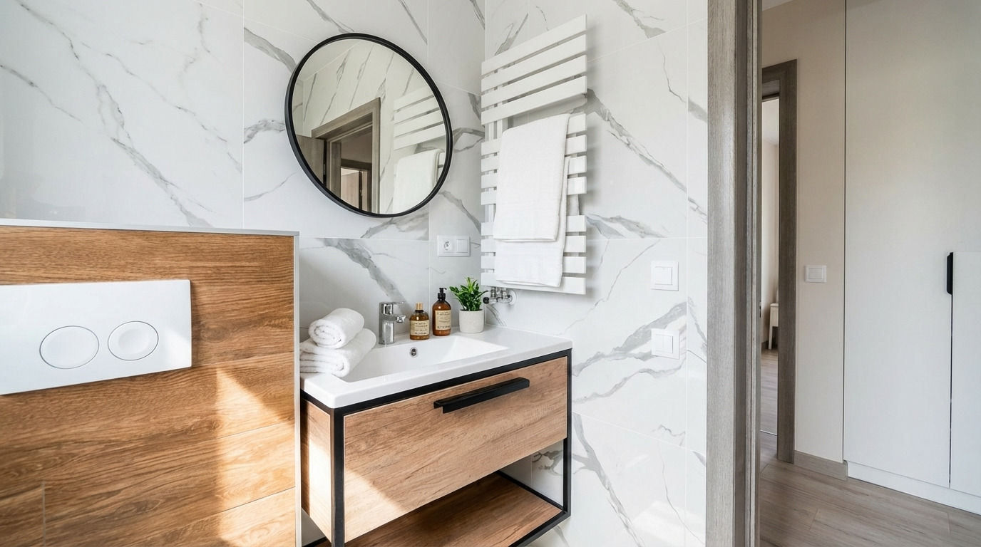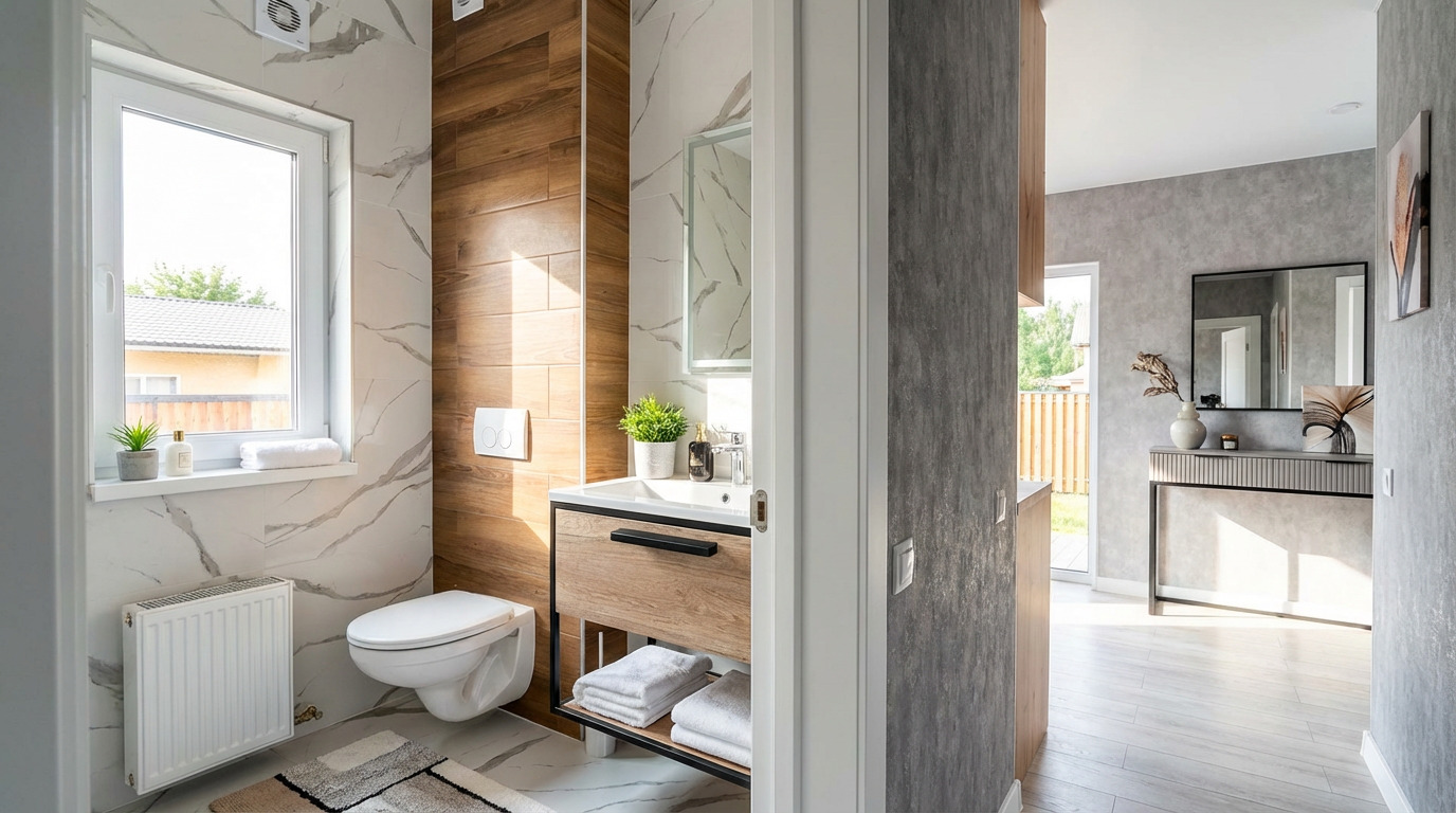 | Sanitaires | Cabine de douche 90×90, WC suspendus (bâti-support) aux 2 étages, Lavabo avec meuble |