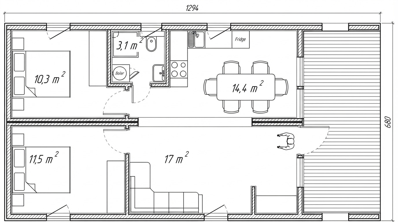 | Dimensions extérieures | 14.2 x 6.8 x 3.3 m (L x l x H) |